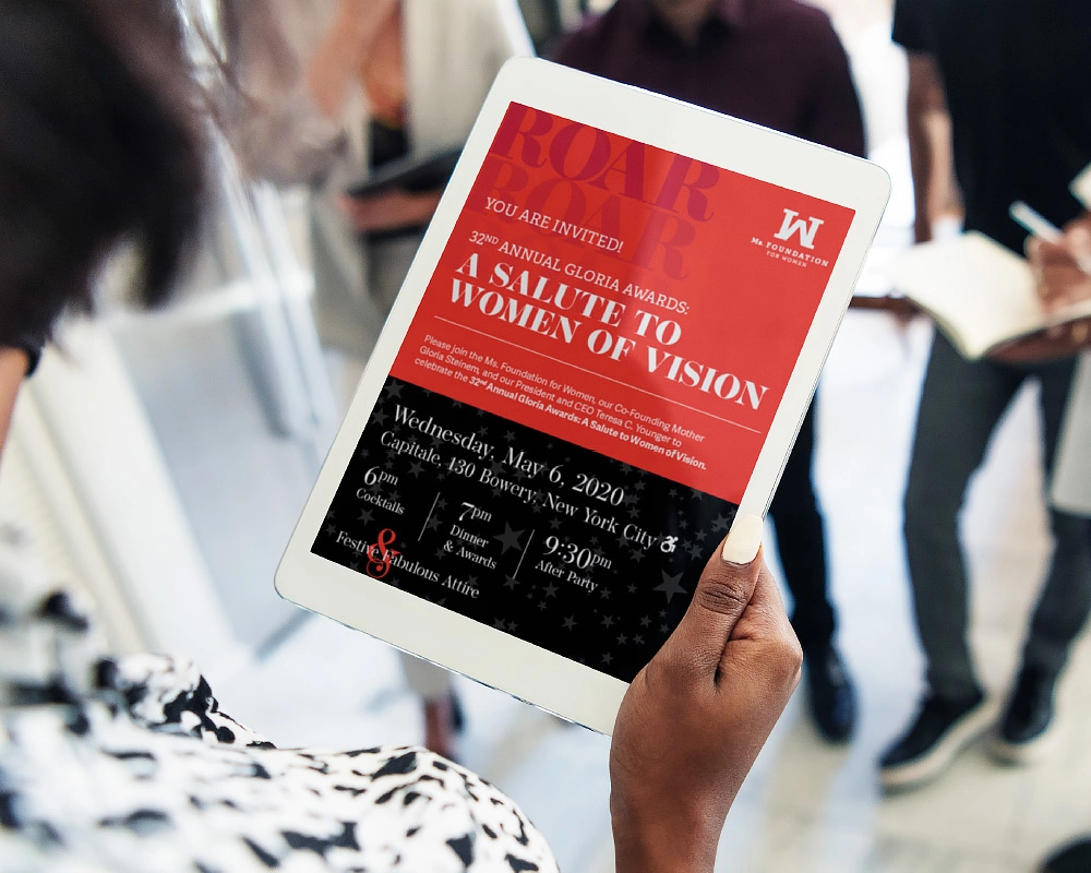Square Root Creative is a woman-owned company. So when Gloria Steinem’s team called, we were happy to roll up our sleeves. The assignment — raise awareness and boost participation in the annual Gloria Awards, the Ms. Foundation’s largest and most important annual fundraising event. Our solution was comprehensive — create a print and digital campaign encompassing everything from event announcements and invitations to event decor and social campaigns.